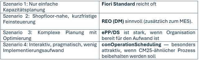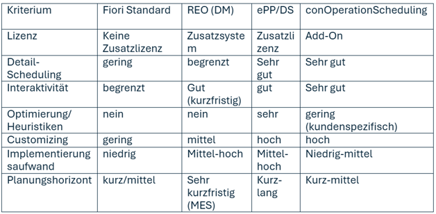 Jede der vorgestellten Alternativen adressiert einen etwas anderen Planungskontext. Während die SAP-Standard-Apps vor allem einfache Szenarien unterstützen, bieten ePP/DS und conOperationScheduling deutlich erweiterte Funktionen für detailliertes Scheduling.
