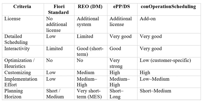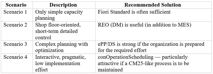 Each of the presented alternatives addresses a slightly different planning context. While the SAP standard apps primarily support simple scenarios, ePP/DS and conOperationScheduling offer significantly enhanced functions for detailed scheduling.